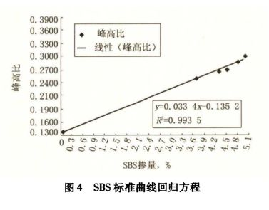 從圖4可知,該回歸曲線方程相關(guān)系數(shù)達(dá)到 0.9935,線性關(guān)系較好??勺鳛楹罄m(xù)SBS改性瀝青中SBS改性劑含量檢測(cè)的評(píng)判計(jì)算標(biāo)準(zhǔn)公式。具體回歸公式如下:y=0.0334元+0.1352(y為峰高比,z為SBS含量)。